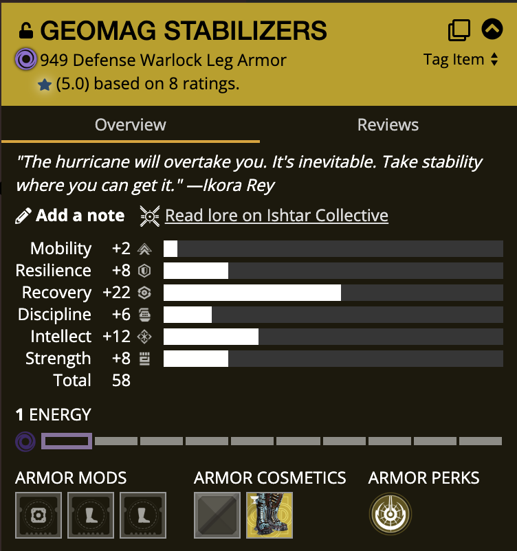| How Armor 2.0 Stats Are Generated Posted: 23 Oct 2019 09:55 PM PDT Some Intro, who cares lets get to the numbers! Note: This is just my best guess at how I think it works so far and isn't set in stone. Take this with a grain of salt. If you have data that goes against anything listed please let me know! Base StatsIndividual StatLooking through the games API we can find a property attached to items called StatGroup. This holds all 6 stats and offers some information at how high a stat can roll. Each stat has a maximum value of 42. This is the highest a stat can be. On blue items you will see stats go up to 42 but that is because they can't be Masterworked or Modded. They are also usually missing a lot of stats elsewhere. On Legendary items it works a little bit differently. If we subtract the 2 stats you get from Masterworking and a possible 10 from Mods (more detail about both below) we get that a stats highest base roll is 30. We can see an example of this HERE. Stats have a minimum value of 0 but this is reserved from Armor 1.0 items and for Armor that you pull from your collections. Armor drops from the game world have a minimum stat value of 2. ClustersArmor stats seem to be rolled in what I've been calling "clusters". Mobility/Resilience/Recovery are the Destiny 2 Cluster while Discipline/Intellect/Strength are the Destiny 1 Cluster. When an item is generated, it's total value is rolled first and then split between the two clusters. It's not always a 50/50 split (more on that below) but it's pretty close. For example: If an item rolls with 60 Total stats then the Destiny 2 Cluster (Mobility/Resilience/Recovery) gets 30 of those stat points while the Destiny 1 Cluster (Discipline/Intellect/Strength) get the remaining 30 points. You can see a good example of that HERE. An important thing to note: The higher one stat goes, the lower the other two stats fall. We can assume that a "perfect" Cluster is a stat breakdown of 30/2/2, and we can see that in the first screenshot linked again HERE. The Destiny 1 Cluster of this item is a "perfect" Intellect roll. God RollIt stands to reason that a "God Roll" item would have a stat breakdown of 30/2/2/30/2/2 or 68 Total. The game would have put all of the points for a Cluster it could into just 1 of the stats, TWICE. As a downside, this would also mean that you can't have an item that has 30 Mobility AND 30 Resilience. Since this would be SUPER hard to achieve, a "Perfect Roll" would just be an item that has the maximum stats at 68 Total. I believe this to be the highest base roll you could achieve. Pinnacle / Exotic BonusPinnacle and Exotic drops are where you can make up extra ground in your stats. They seem to have a higher floor for their stat generation, meaning they should usually roll with better stats than items you find elsewhere in the game. Also, after these items get their stats, one of the two Clusters also gets a bonus to it's stat rolls. From the looks of it the bonus is an extra 0-10 spread across the three stats of a Cluster. You can see that HERE, HERE, and HERE. This bonus helps Pinnacle and Exotic items push closer to 68 or even surpass it, making them very sought after item drops. A high roll and a high bonus could push an item to 70 or maybe even beyond. We won't know an actual cap until someone gets this monster to drop. I assume it to be 78 just based on the data I've seen so far (68 base + 10 bonus). I think this step also happens on regular items as well (which is why you can find items that aren't a 50/50 split) but I think this bonus rolls lower for normal items and higher for Pinnacle and Exotics. You can figure out an items Bonus Stat by adding the two Clusters up and subtracting them from each other. The remaining value is your bonus. Going back to THIS IMAGE we can see that the Destiny 2 Cluster is 27 points, the Destiny 1 Cluster is 34. That means that this item has a bonus 7 points in the Destiny 1 Cluster. The bonus is high because it's a Pinnacle raid item. Above and BeyondMasterworkMasterworking an item gives it +2 in all six stats raising it's base stat Total by 12. This allows us to not only surpass the maximum of 68 on an item, but also get an extra 12 stats from our Class Item, as it still has stats. Something we can leverage! ModsThere are mods for each of the six stats. Each mod raises that stat by a full 10 points. We can put on 50 of these mods effectively raiding our total stats 50 points! There are some downsides to this: First, we lose out on a mod slot that could be going to another mod. Second, some of these mods cost more than others. Intellect takes 5 Energy and Recovery takes 4. That's valuable energy you could be using for other mods. This also means that Intellect and Recovery are the two more important stats to have on your armor piece as they are the harder ones to make up. Theory CraftingMax StatsWith all of this in mind we can calculate what would be the maximum possible stats you can have on a character. We take the highest roll for an armor item (78) and add to it the amount of stats for Masterworking (12) and the stats for having one Mod attached (10) to get 100. This is the highest value each armor item can give. If we multiple that by 4 and add our Class Item (12 for Masterwork + 10 for Mod) we get 422 Total Stats. This appears to be the highest you can go with PERFECT rolls on every item. It is very unlikely anyone will hit this value. Tier Breakdown